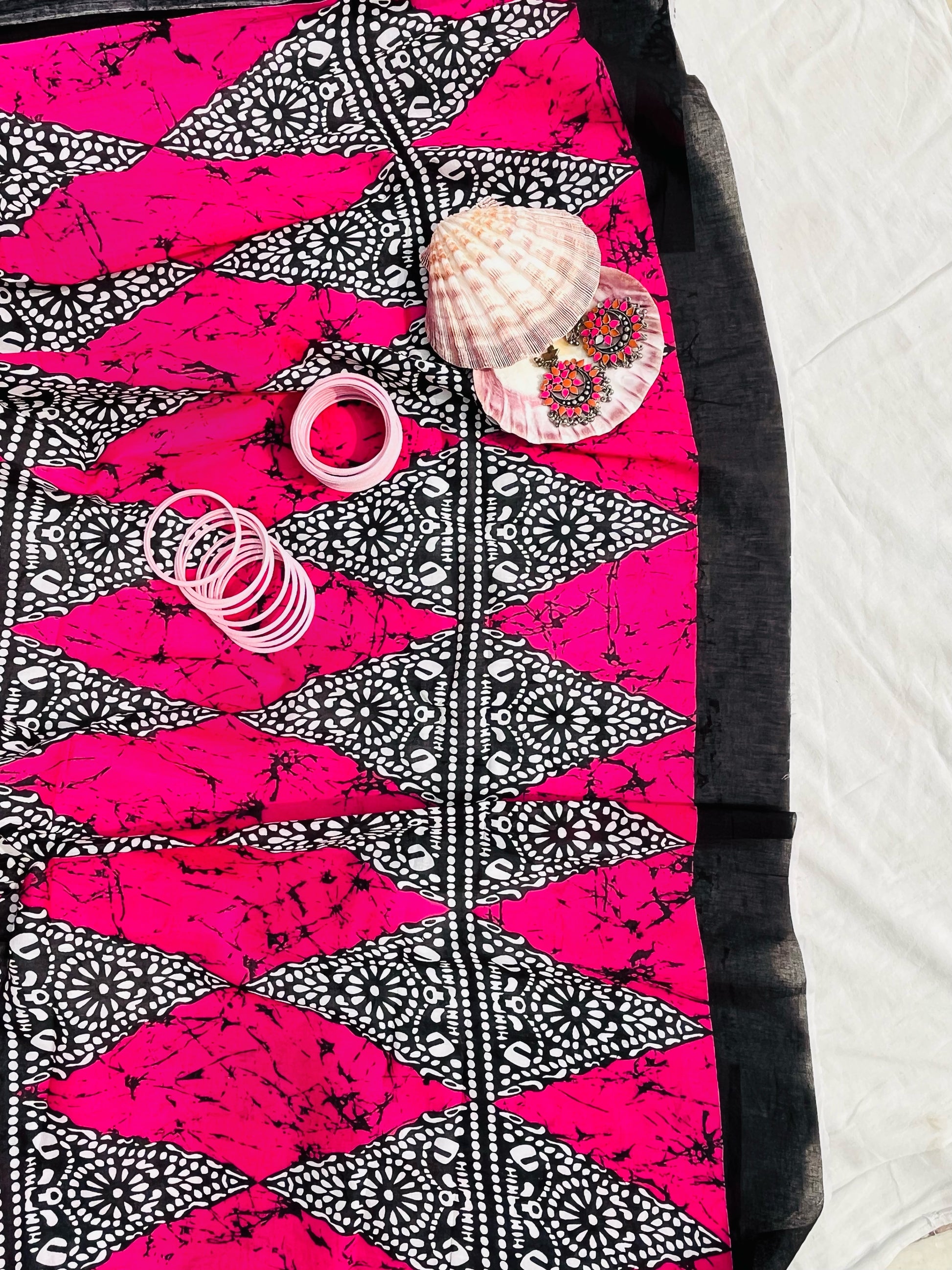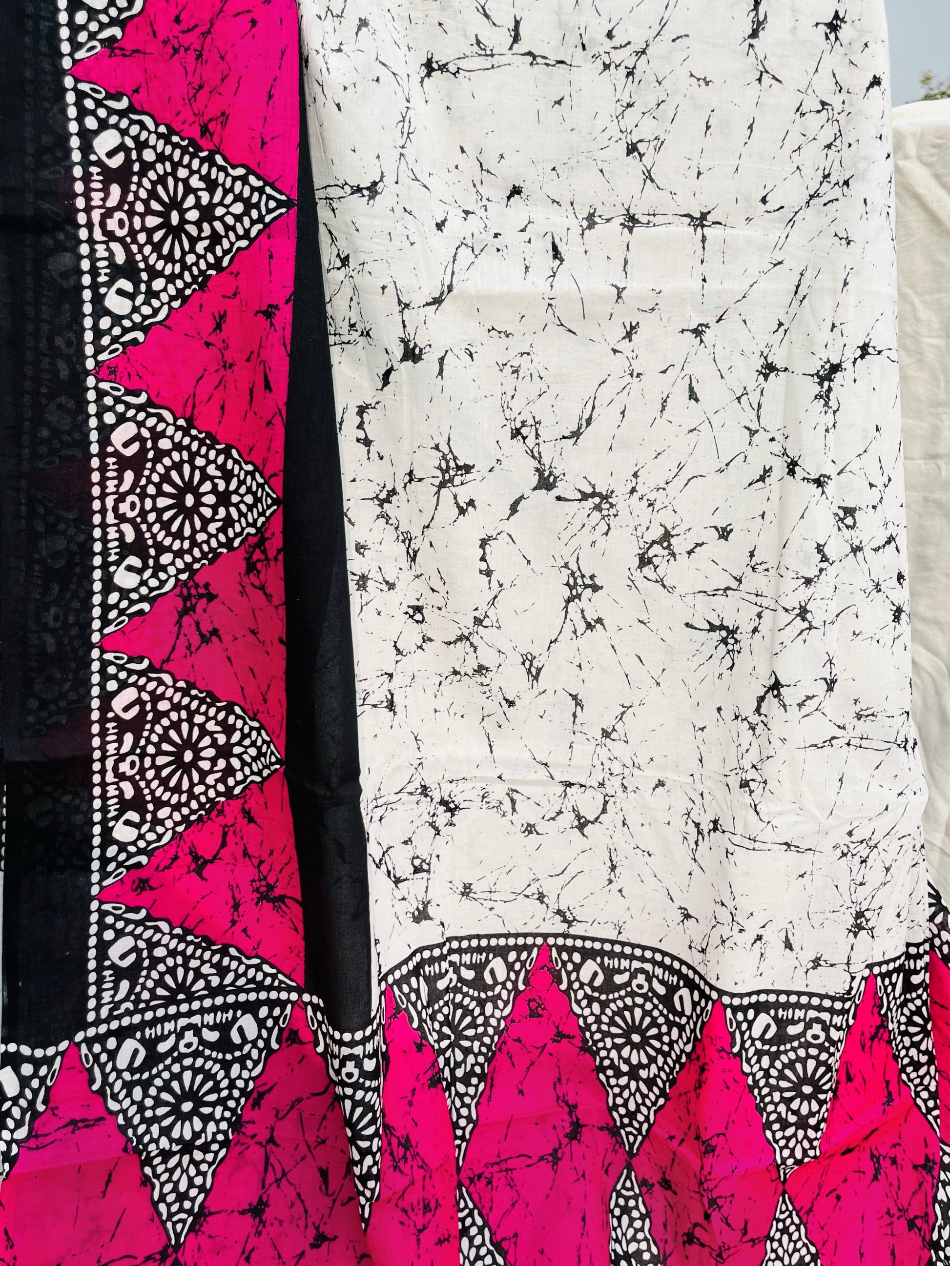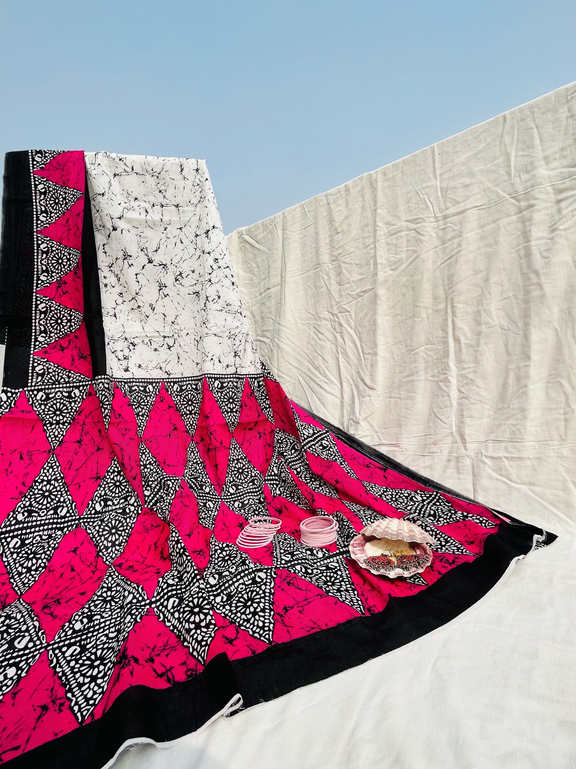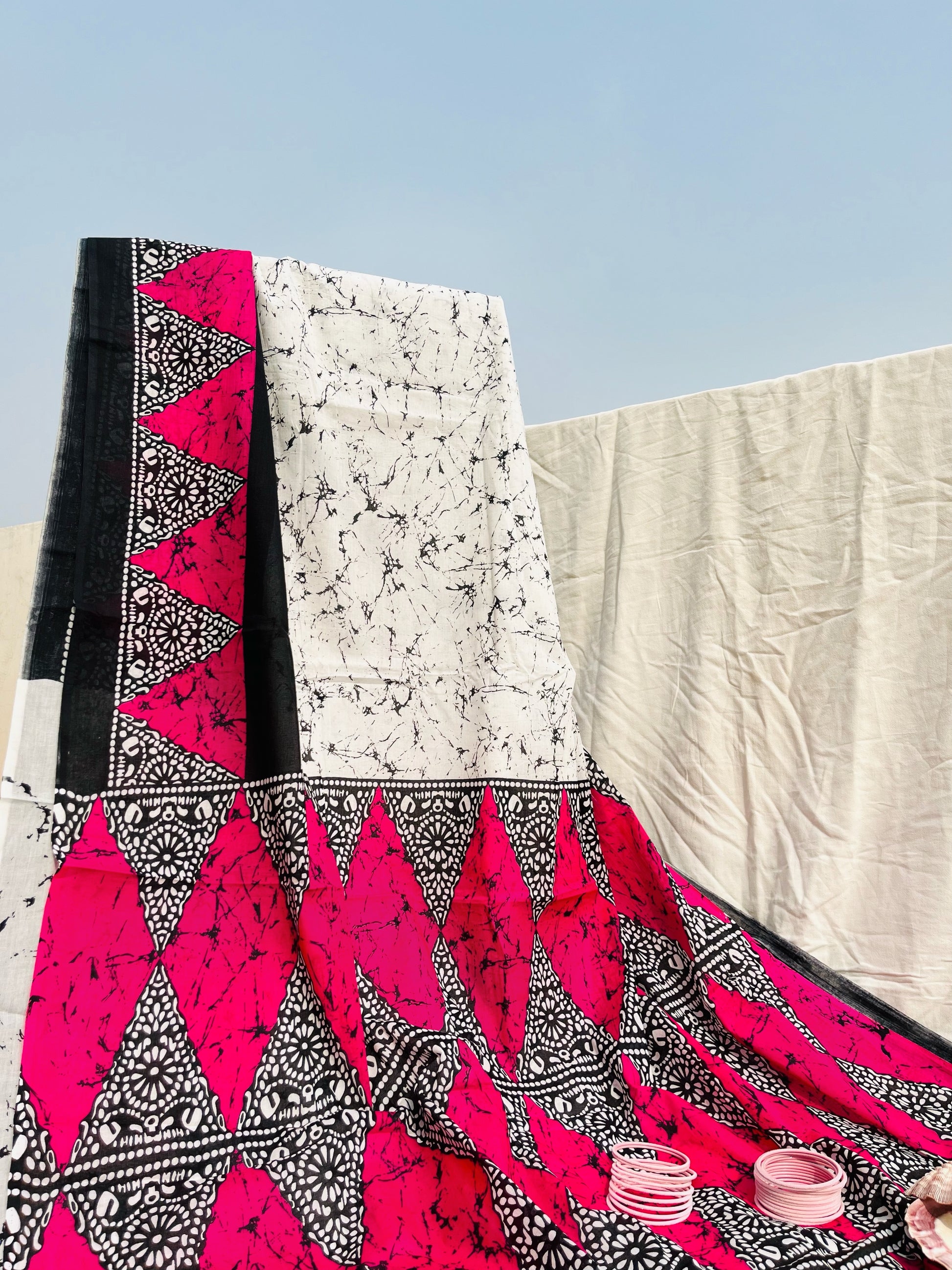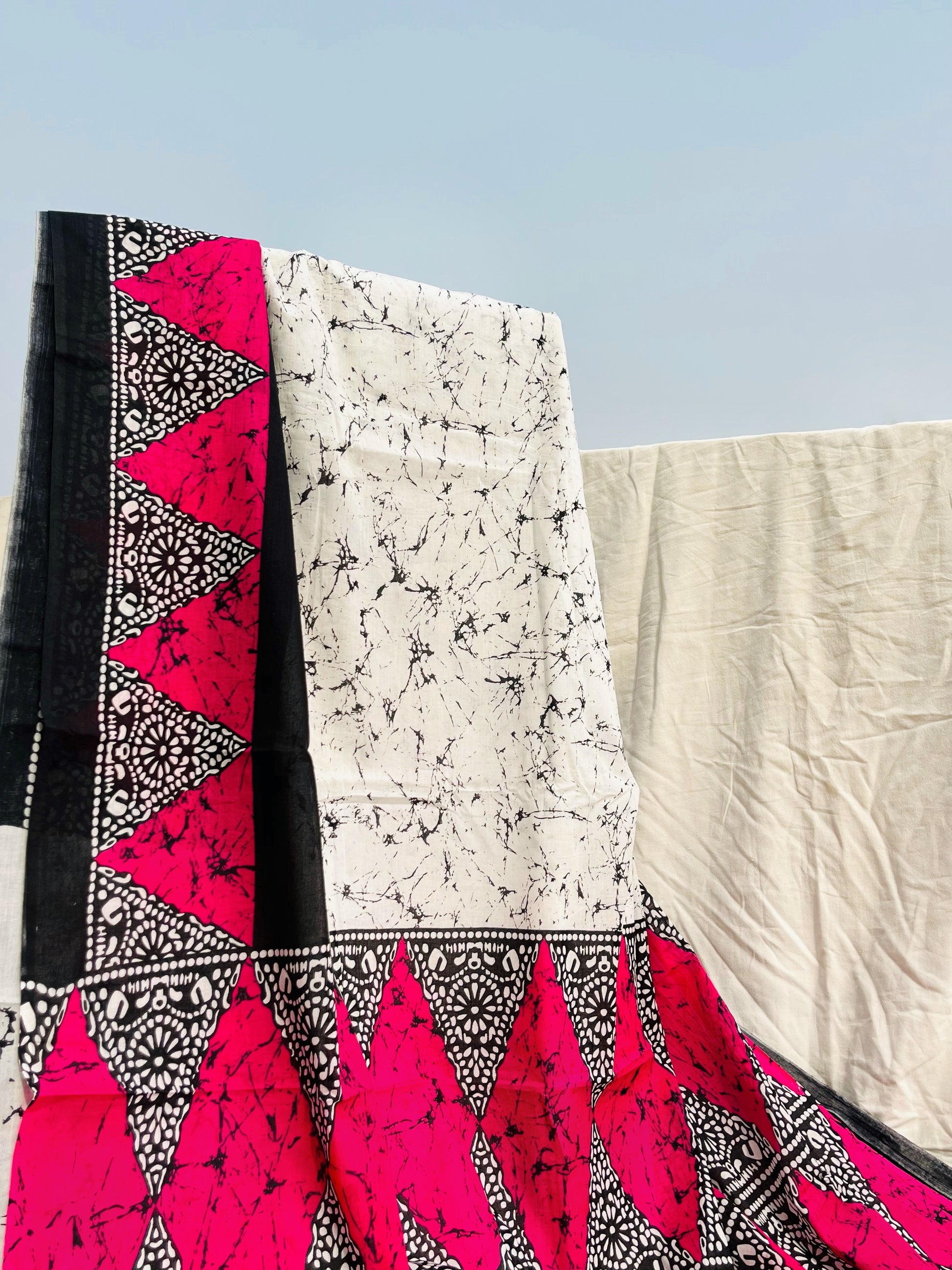 This saree is a celebration of understated elegance. The pristine white fabric, adorned with a delicate pink border, creates a striking contrast that's both timeless and contemporary.