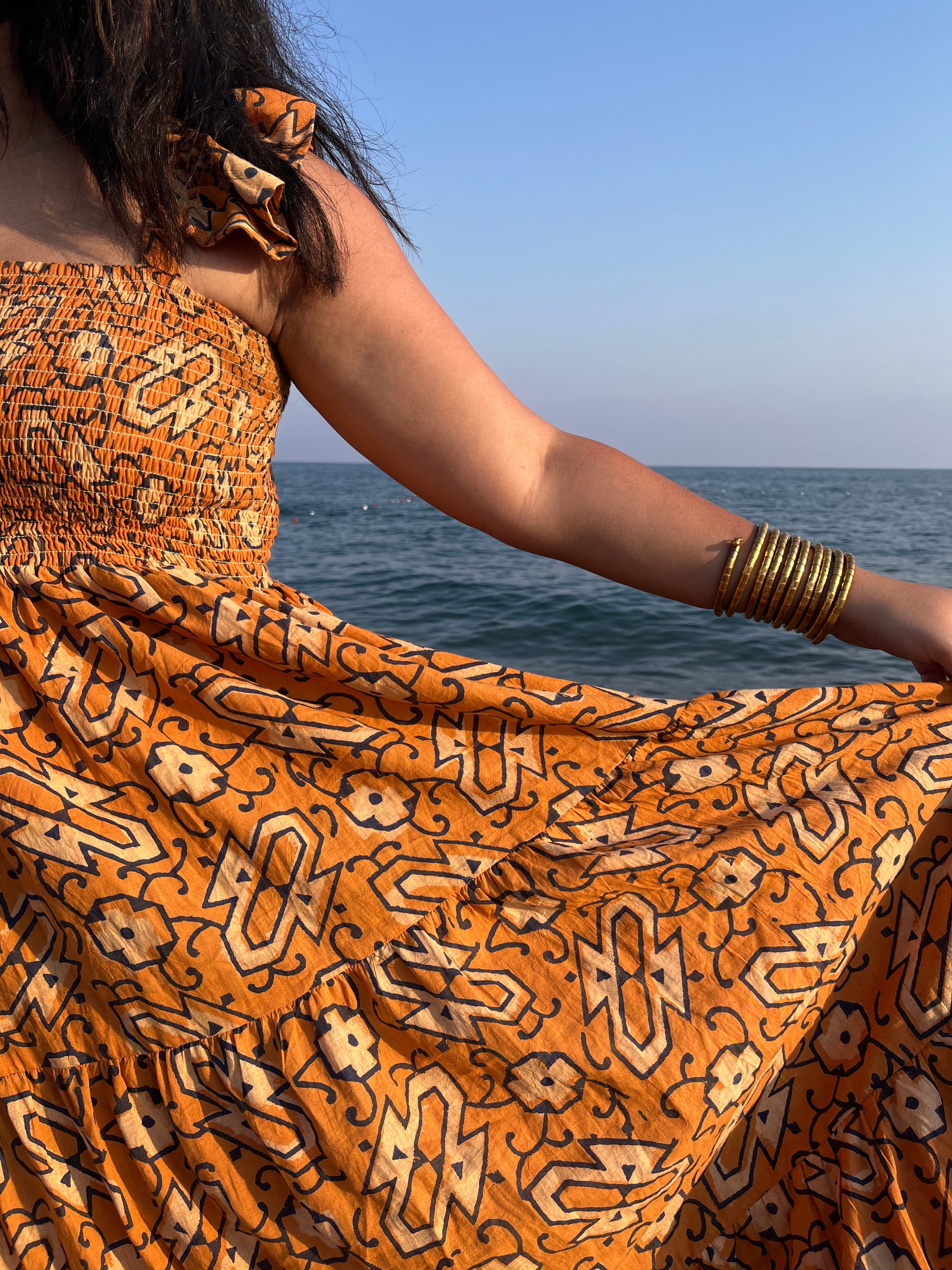 Unleash your inner goddess with the Cairo Dress! This show-stopping dress boasts a rich mustard-yellow base that's sure to turn heads. The layered design features cascading ruffles that add a touch of drama and movement, while the captivating asymmetrical pattern evokes the timeless elegance of ancient Egypt.