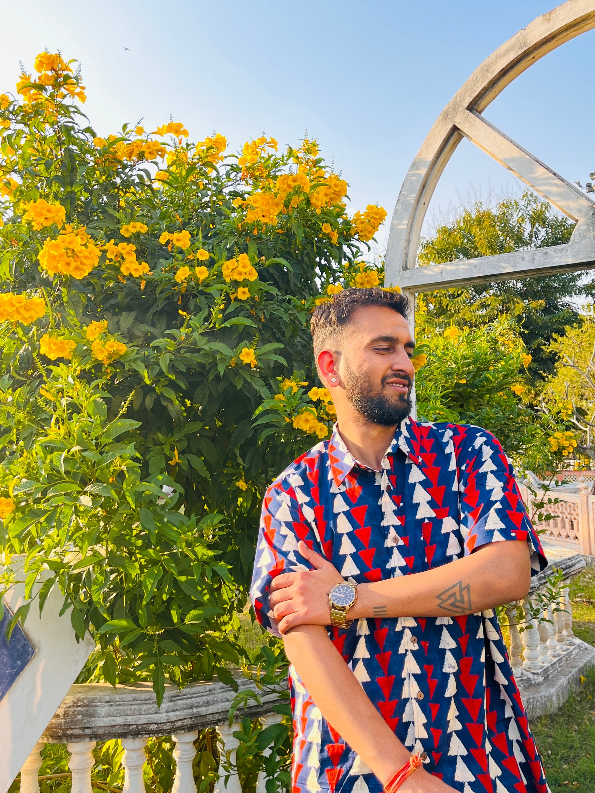 Don't be fooled by its deep blue facade, this shirt hides a playful spirit within! The bold red and white pattern adds a touch of mischief, making it perfect for those who like to break the mold. So ditch the boring blues and embrace your inner rebel with this unique piece.✨
