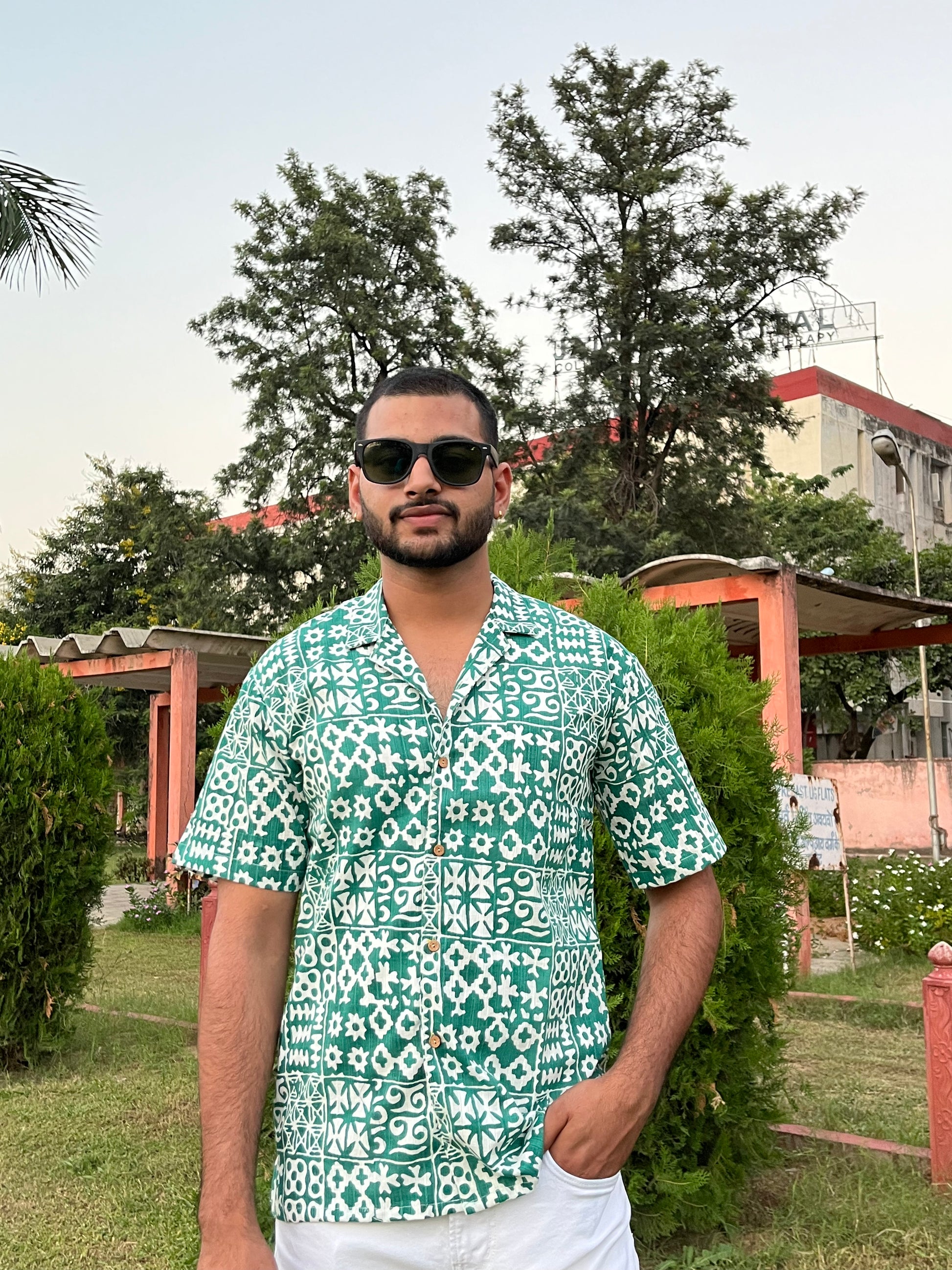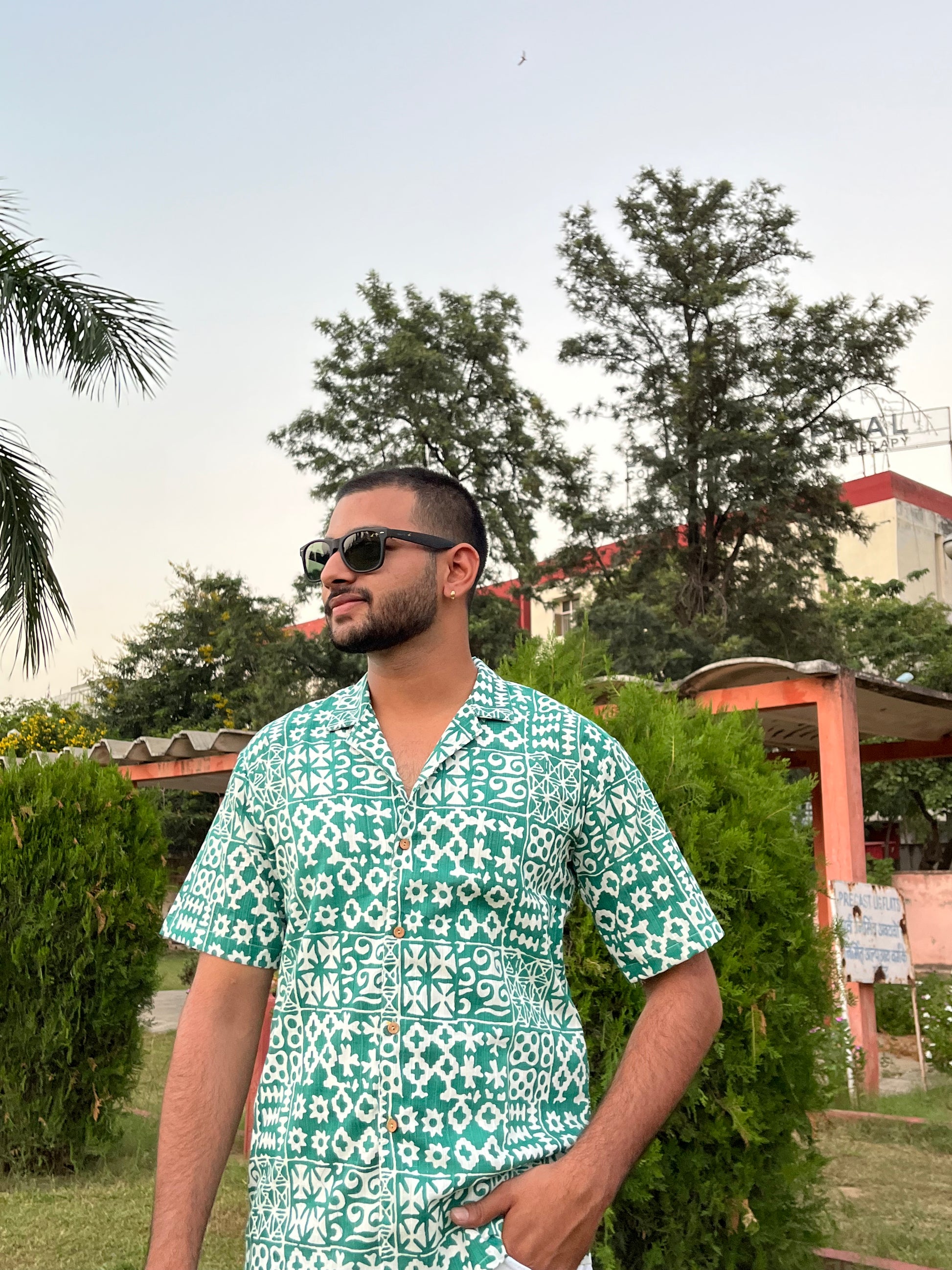 Elevate your wardrobe with our classy Bagru Print shirt, a masterpiece that effortlessly blends tradition and elegance. π With its pristine white base adorned with intricate deep dark green textures, this shirt is a symbol of timeless style and sophistication.