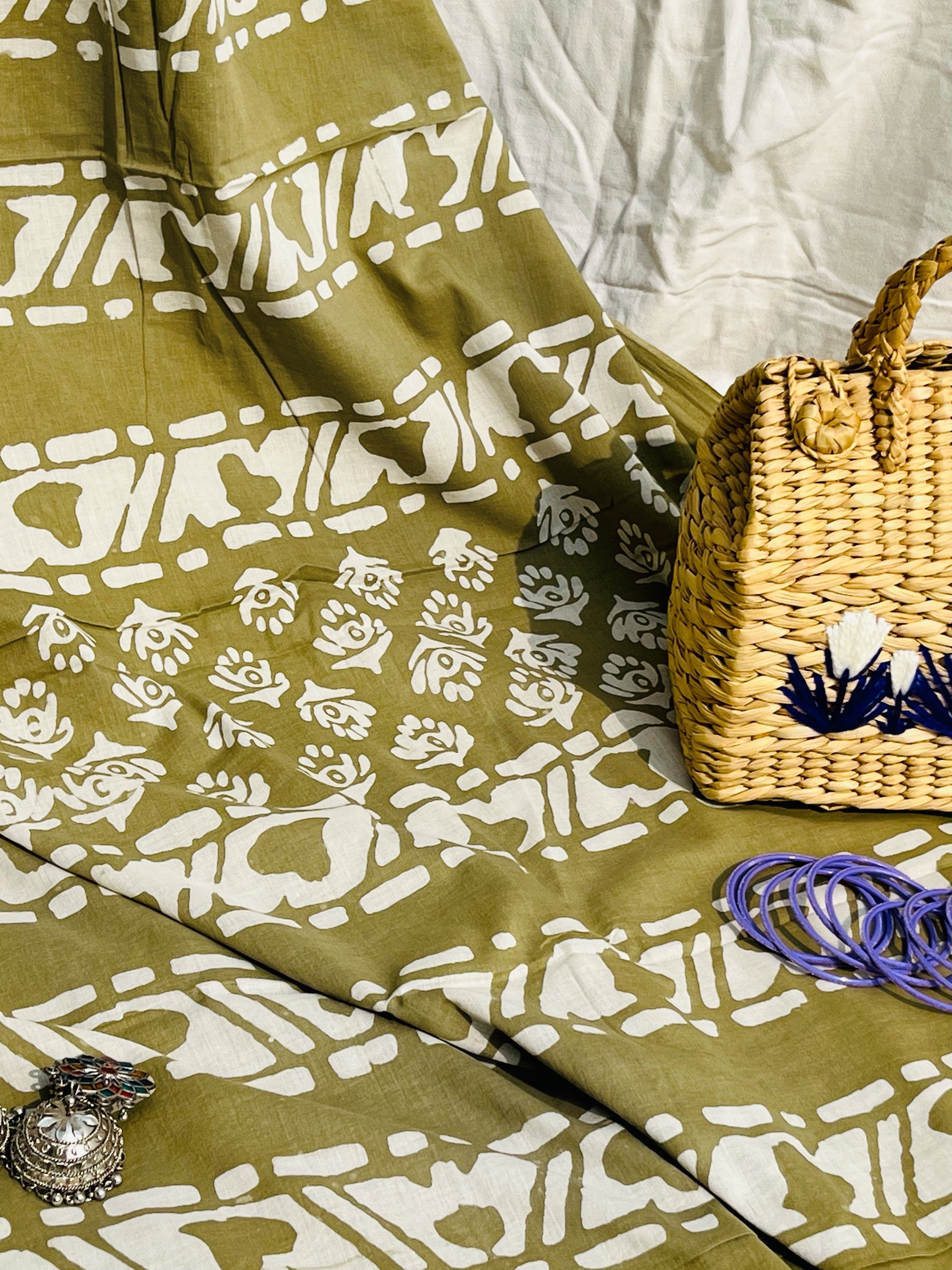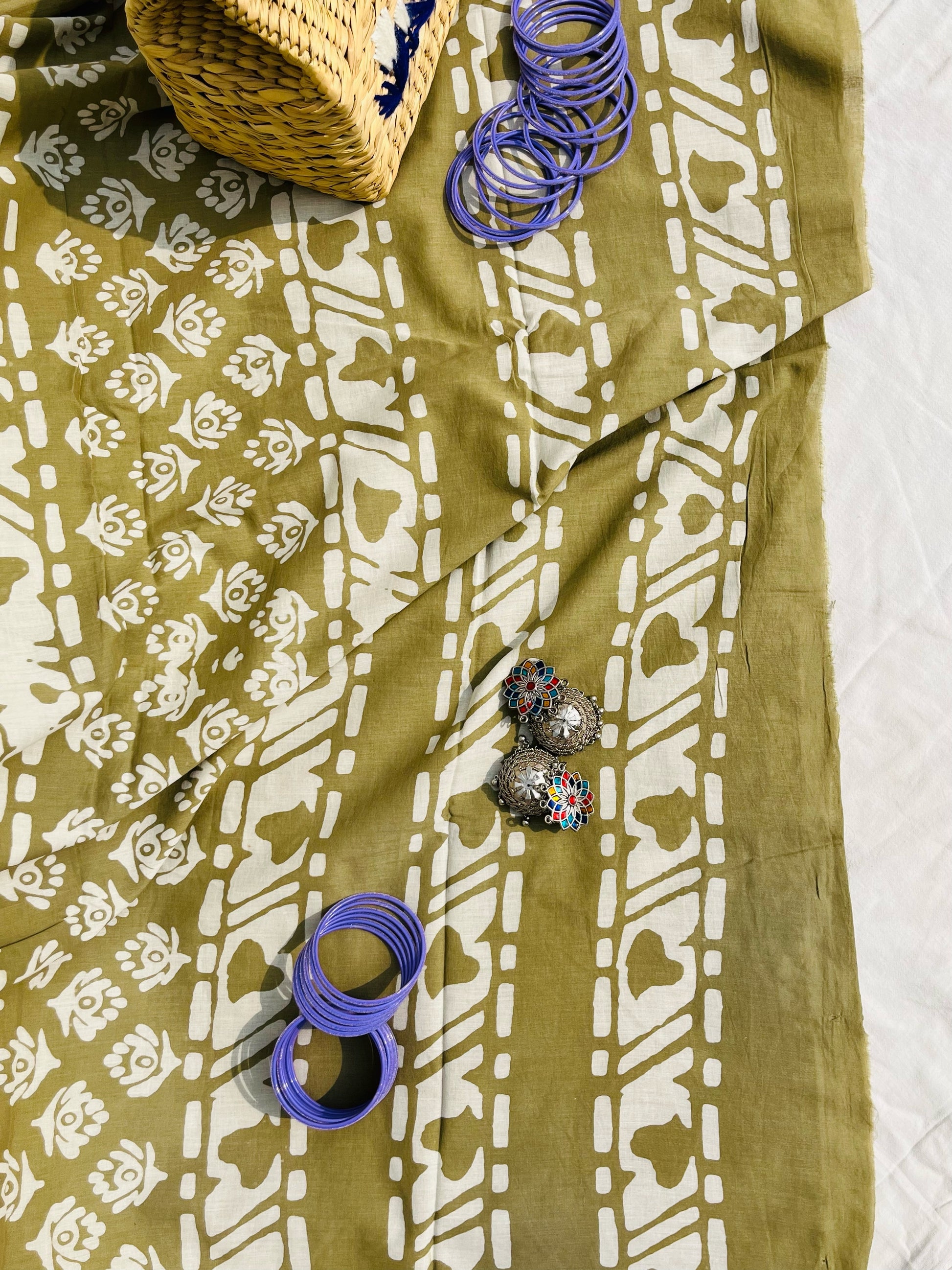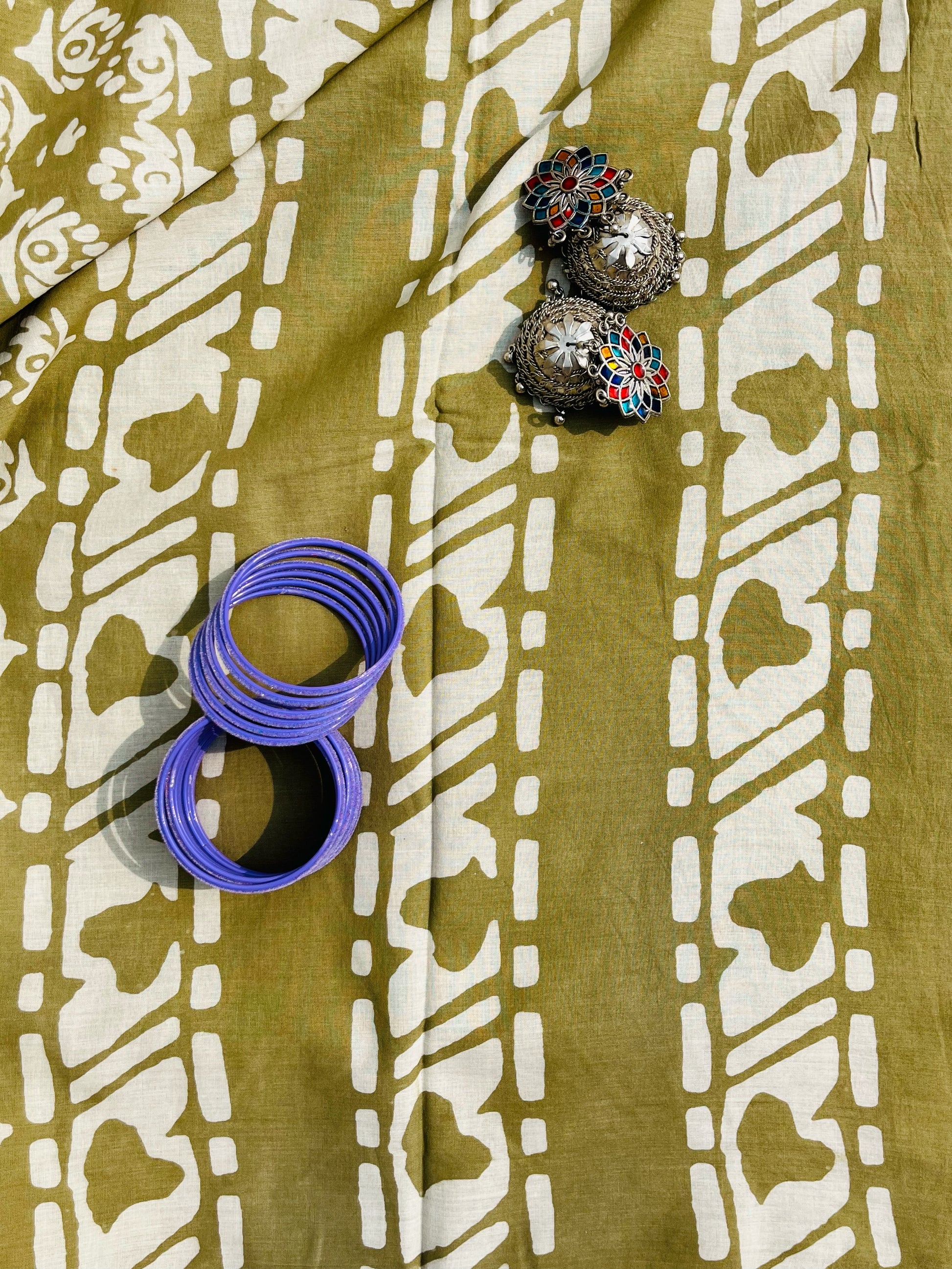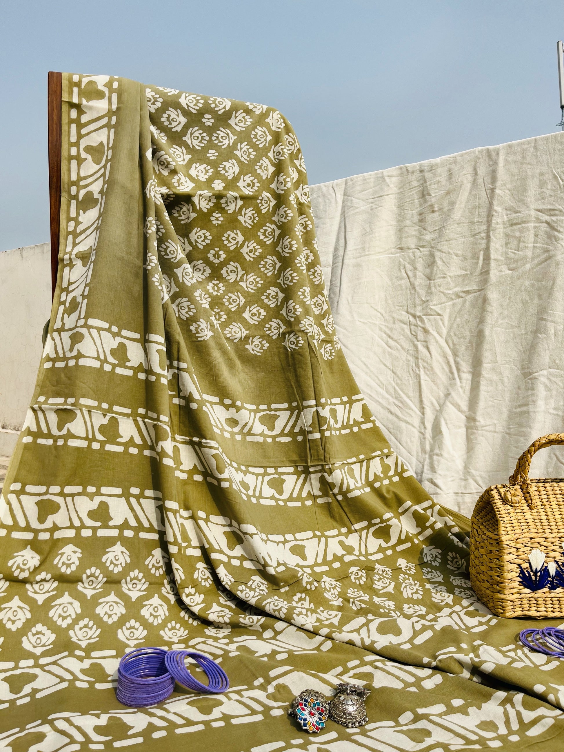 The lush green hue of this mul mul saree is like a breath of fresh air. It exudes the elegance and vibrancy of nature, making it the perfect choice for both formal events and casual gatherings.