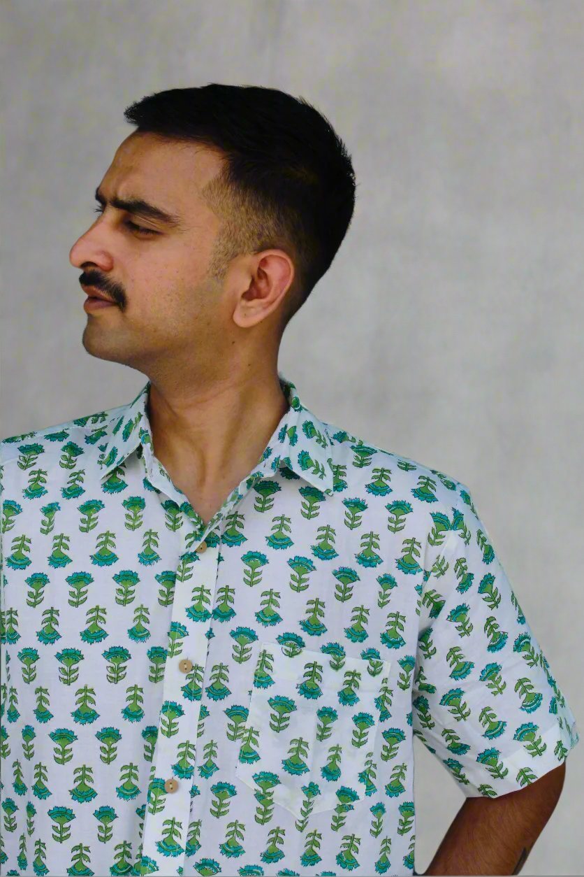 Less is more, but who says minimal can't be playful? This white shirt is the blank canvas to your self-expression. The subtle green Bagru print adds a touch of intrigue without stealing the show ✨. Pair it with anything and everything - it's the chameleon of your closet, ready to adapt to any adventure ✈️