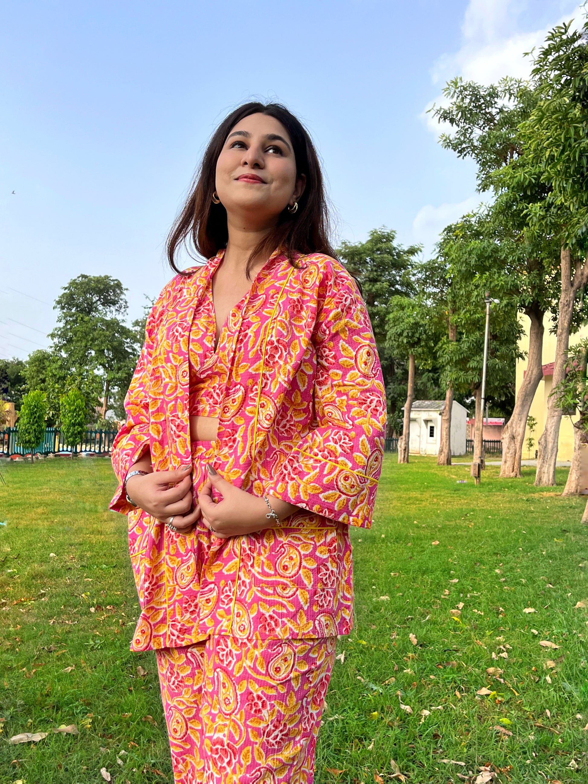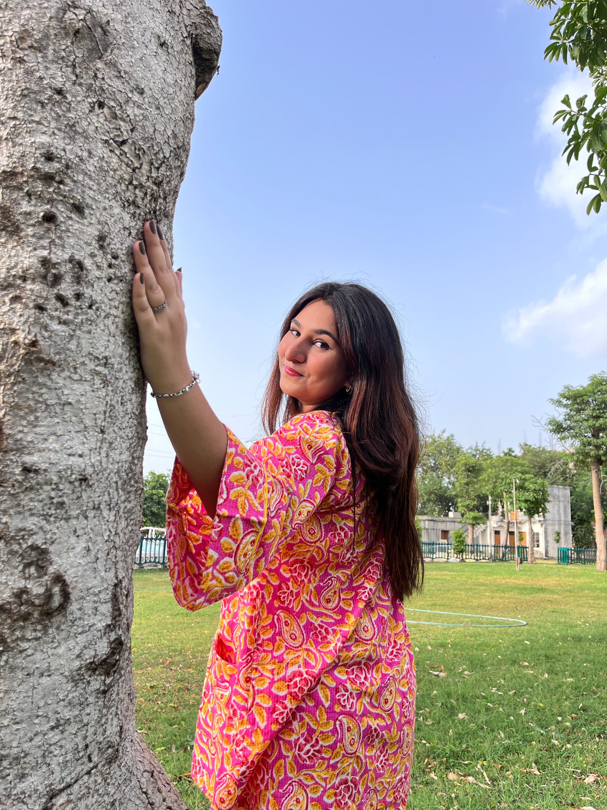 Whether you're hitting up a music festival, hanging with your squad, or just want to add a pop of personality to your everyday look, the Pink Lemonade Kantha Funk Kimono has got your back. Its flowy silhouette drapes effortlessly over any outfit, giving you that effortlessly cool vibe you've been cravingπβ¨