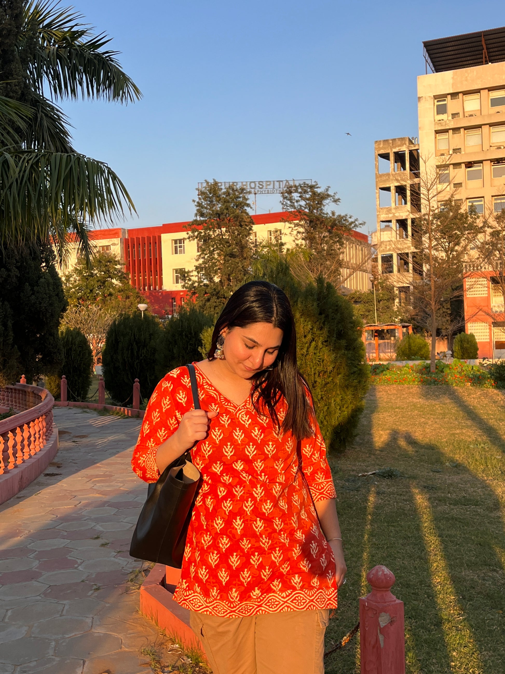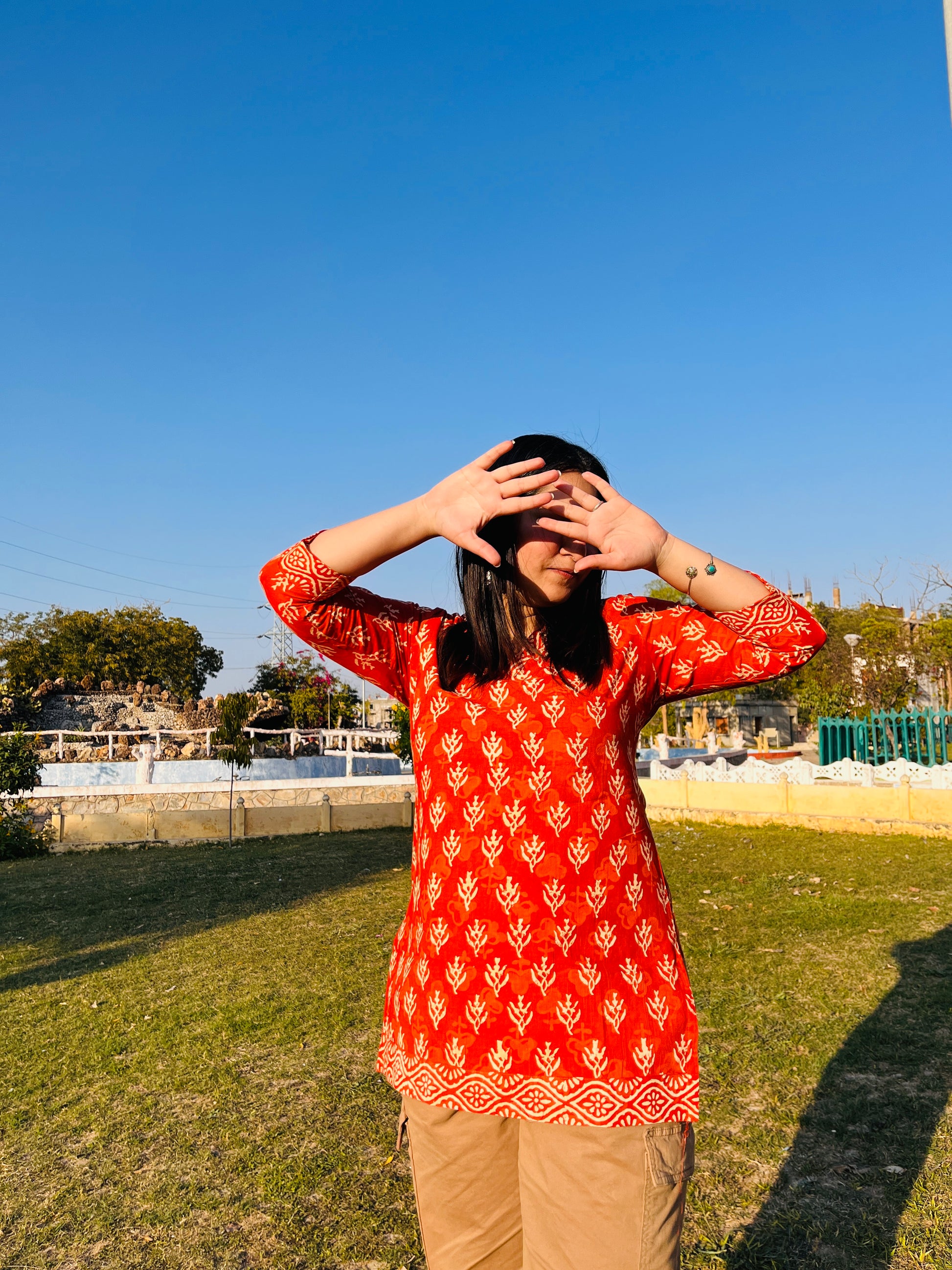 Perfect for those breezy summer evenings or a casual day out with friends, this kurta adds a playful touch to any ensemble. Embrace the magic of dusk with our Reddish "Sunset" Dabu Short Kurta! ☀️